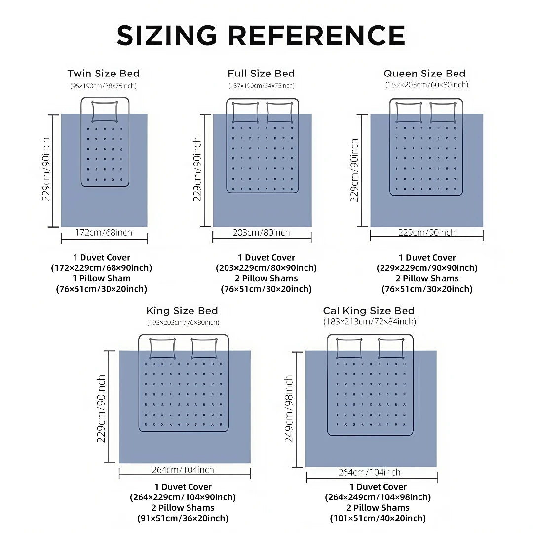 - US Sizes: Twin, Full, Queen, King, California King