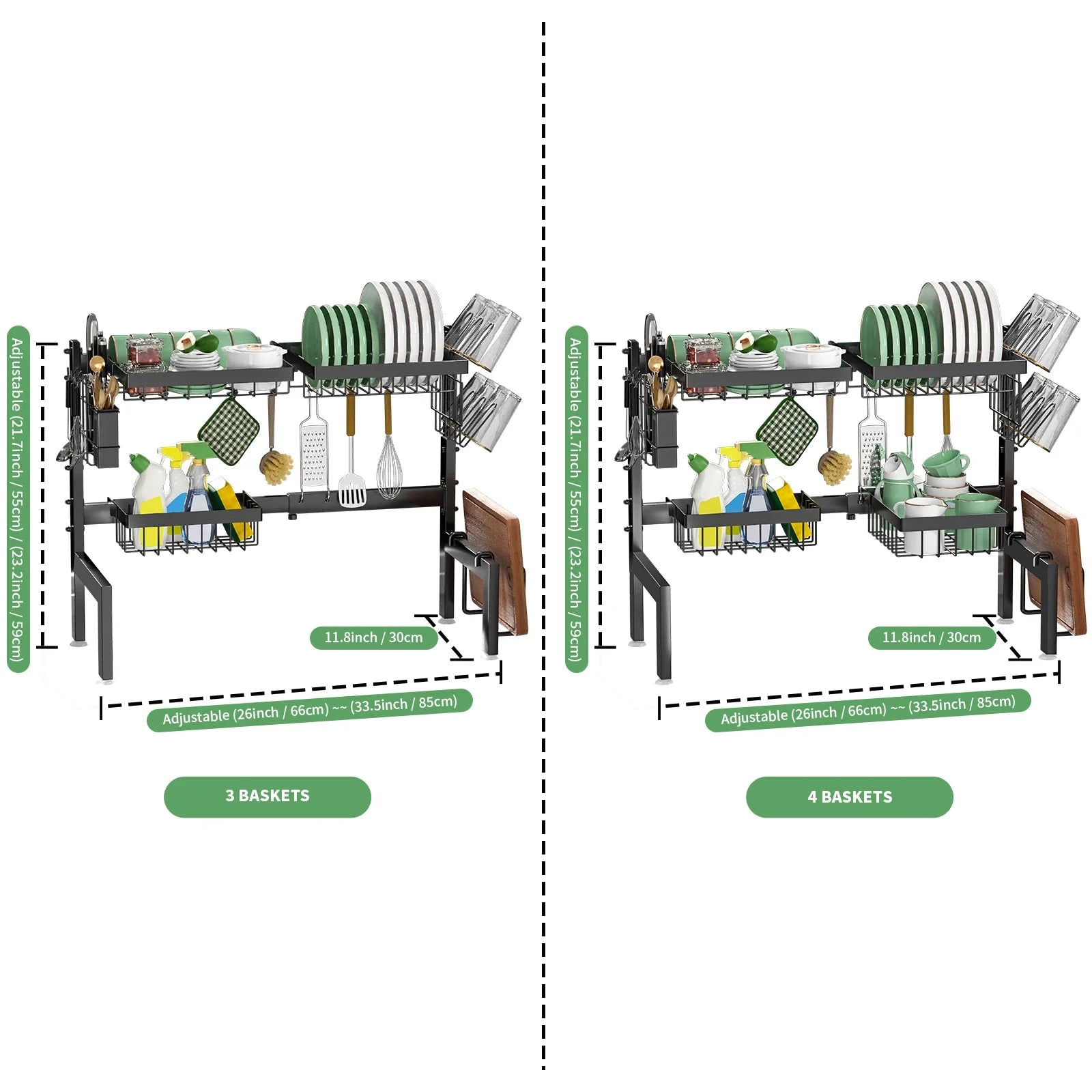 Upgrade your kitchen with this large over-the-sink dish drying rack designed to maximize vertical storage without taking up valuable counter space. Made from rust-proof steel iron, it features an adjustable length range of 26"–33.5" and adjustable height from 21.7"–23.2", ensuring a perfect fit for most sinks. The retractable frame accommodates both single and double sinks, while multiple hanging baskets and accessories create customizable storage for plates, bowls, utensils, cutting boards, and cleaning tools. Water drips directly into the sink for efficient drainage, and assembly is quick with included tools. A durable multifunctional organizer that keeps your kitchen clean and clutter-free.